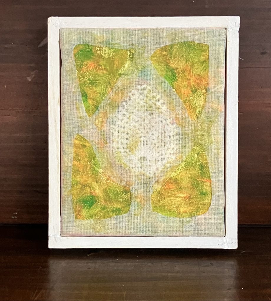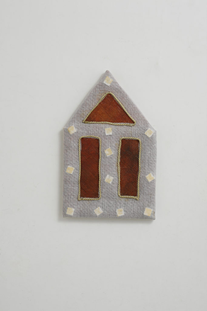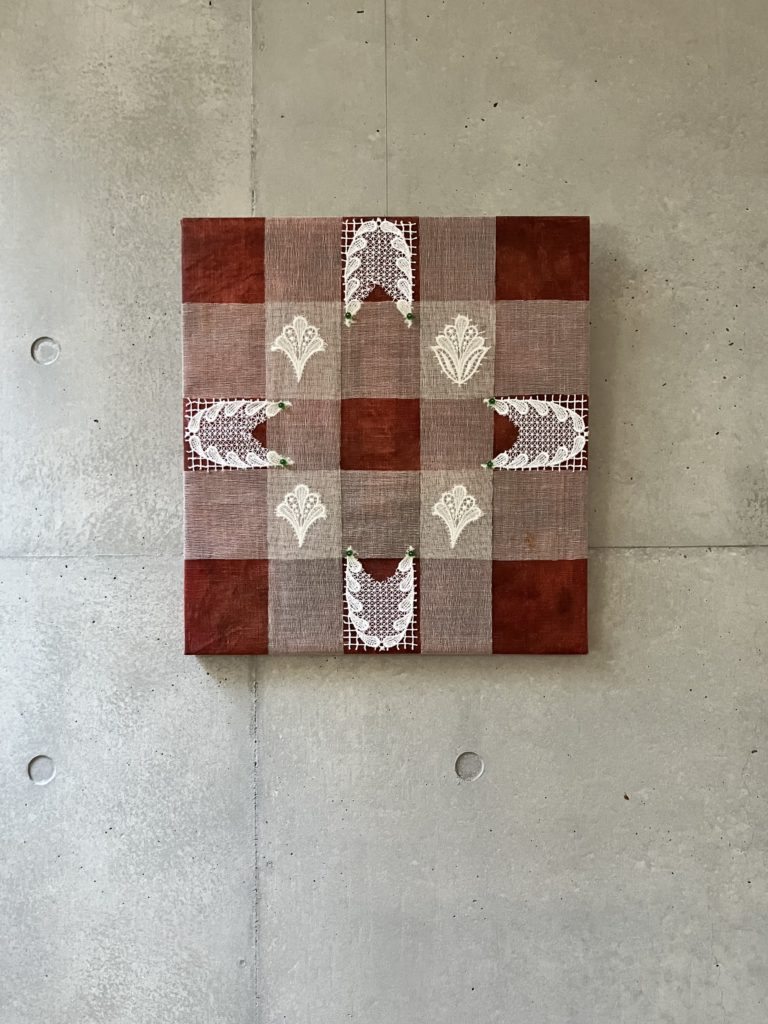 油彩に寒冷紗と大理石、紐を組み合わせています。