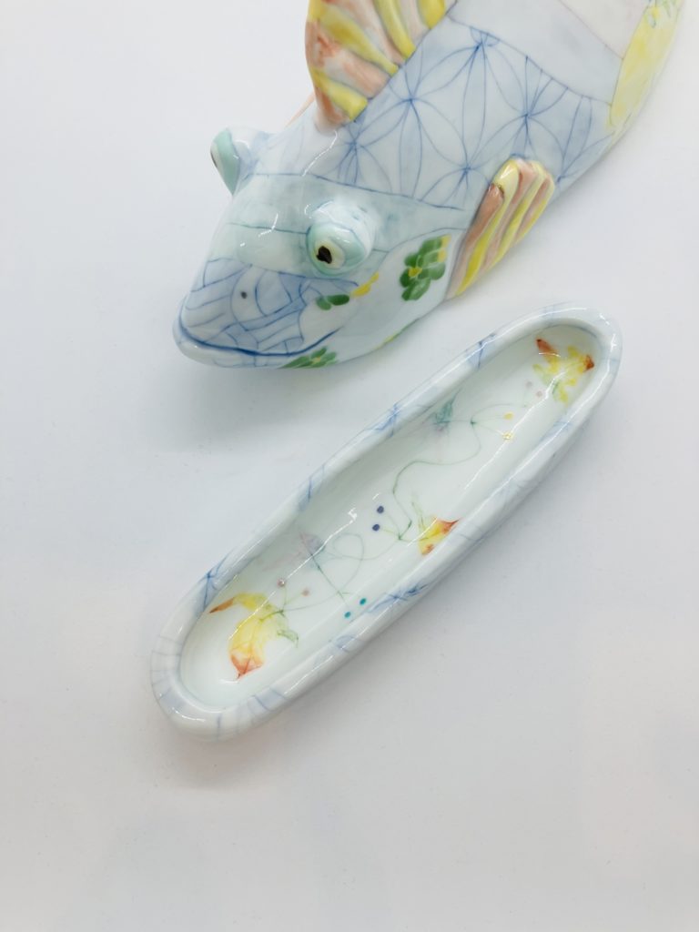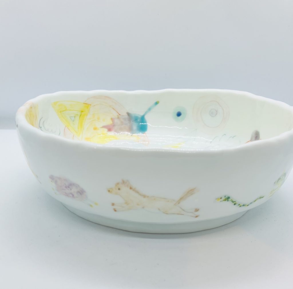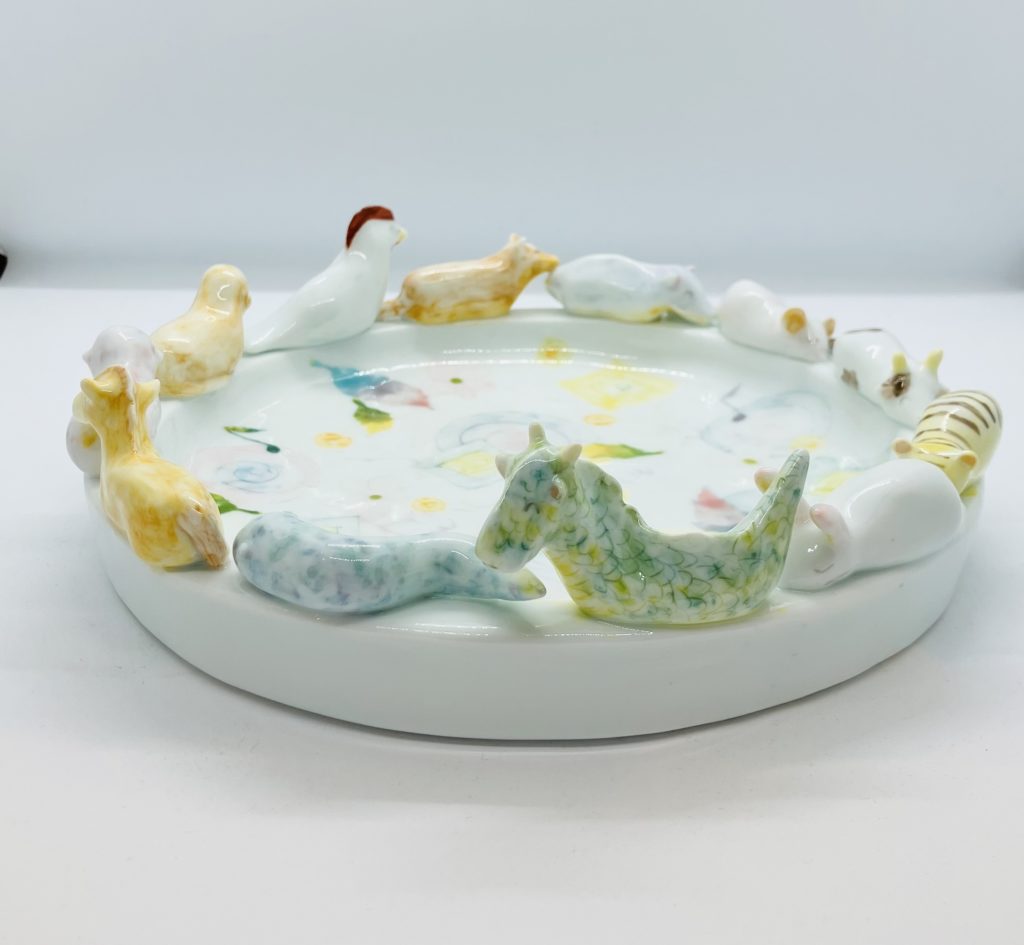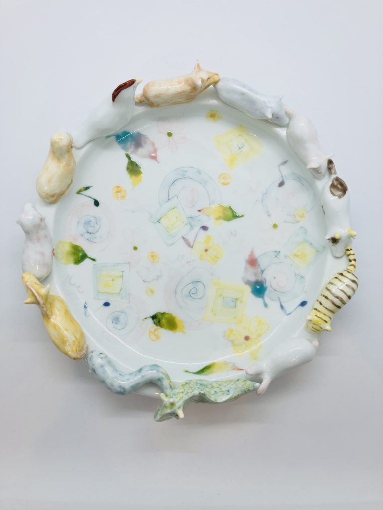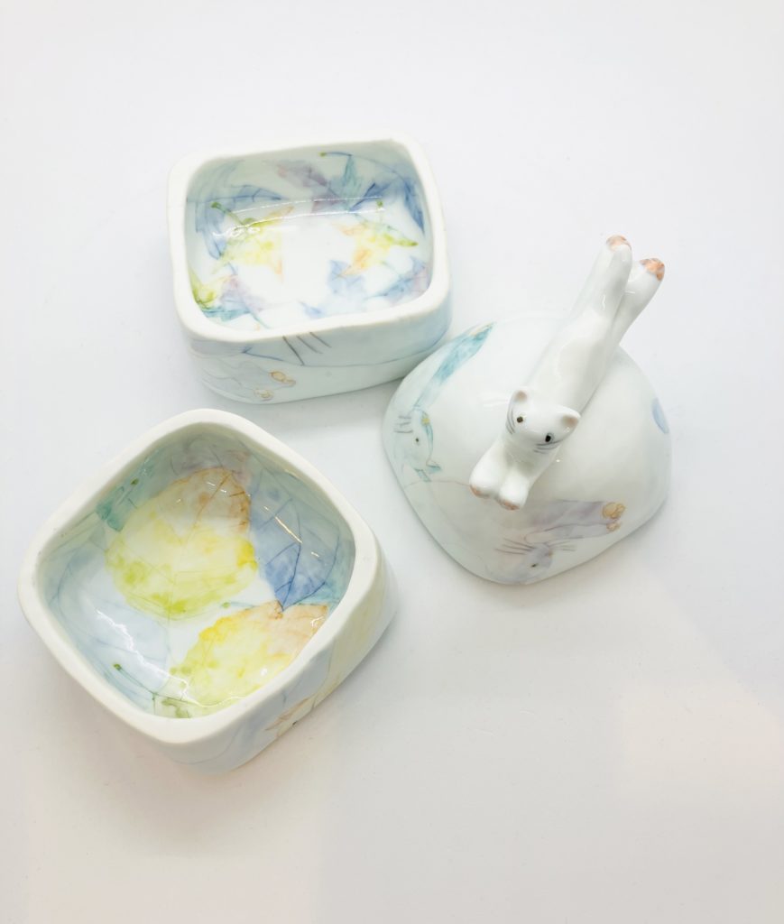 おおやまともこさんの磁器と手塚小雪さんの現代アート。